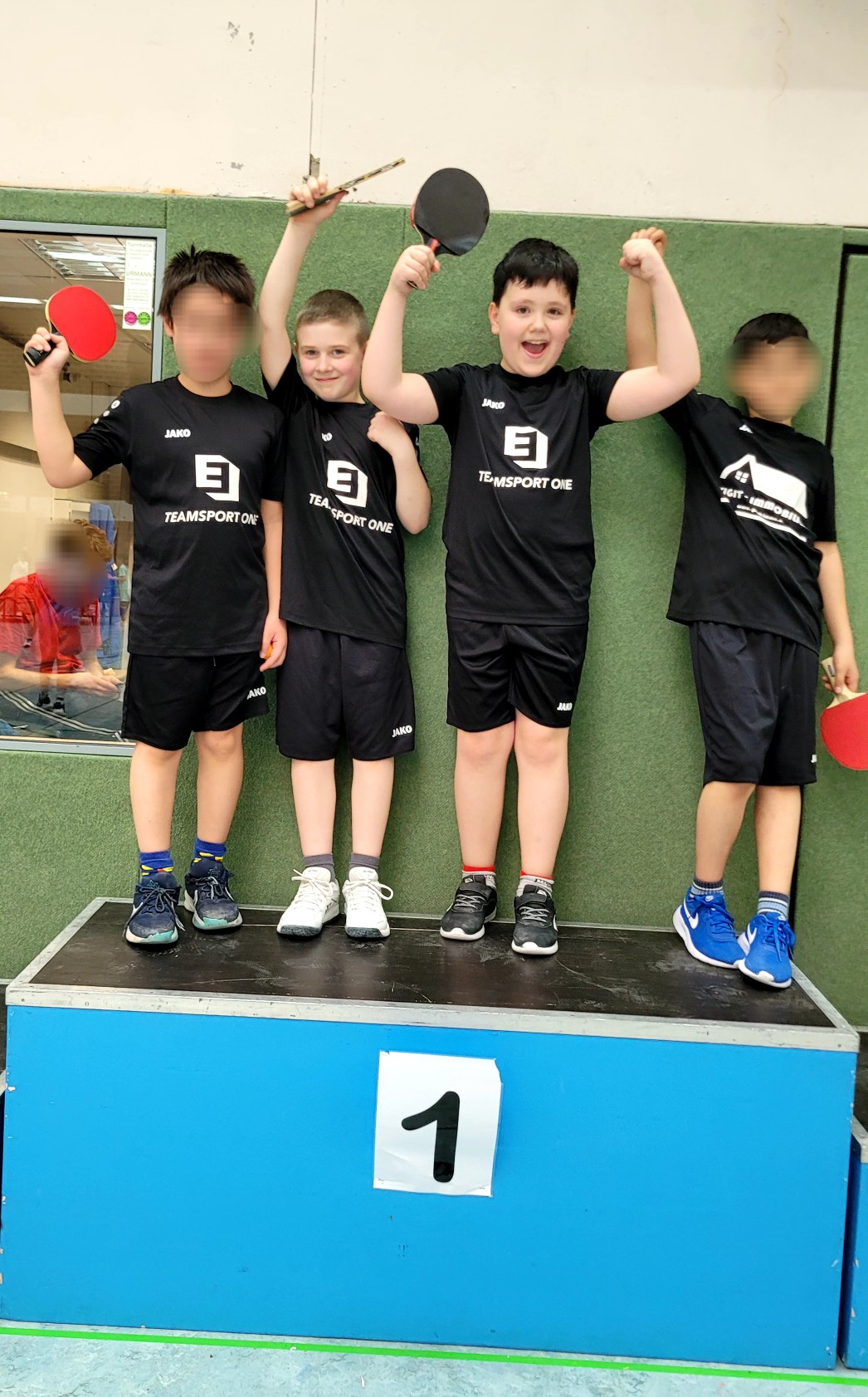 Auch die Viertklässler mit Lennart, Elias, Louis und Janis – darunter Lennart und Elias als Landesmeister des vergangenen Jahres – zeigten großen Einsatz in einem sehr ausgeglichenen Teilnehmerfeld. Viele Begegnungen verliefen äußerst spannend und gingen nur knapp aus. Im Halbfinale traf das Team auf den späteren Bezirksmeister aus Aachen und musste sich dort ebenfalls knapp mit 2:3 geschlagen geben.